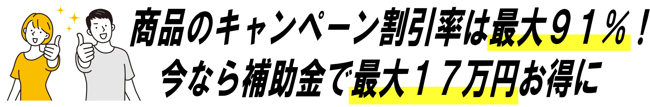2025年の今なら国と自治体からの補助金で最大17万円お得になります。また、現在はキャンペーンで商品価格が最大で91%オフ!(※現場の状況や機種によって料金は異なります。詳しくは以下「きゅっと公式サイト」でチェック!)
